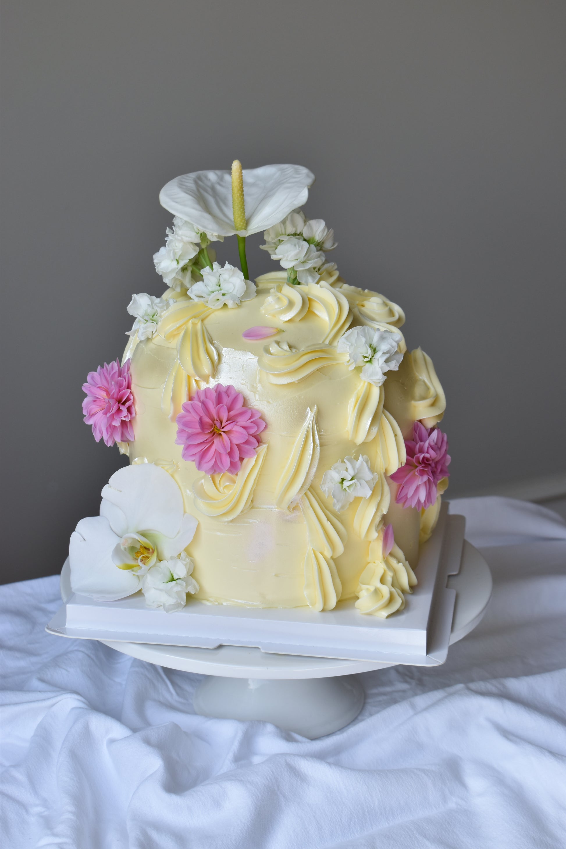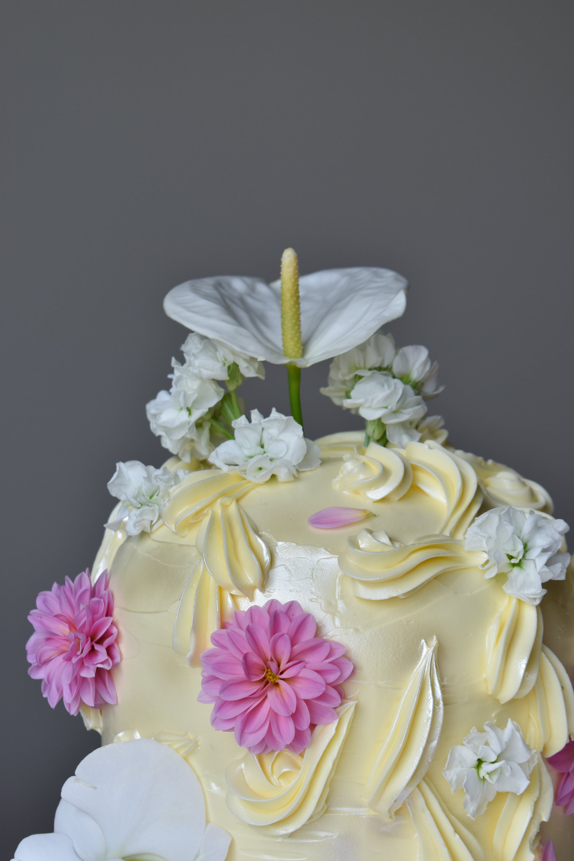 An elegant statement cake inspired by shine, sculptural domes, floral details, and rich textures. Finished in silky magic buttercream, its refined design catches the light beautifully, making it a true centrepiece for modern celebrations.